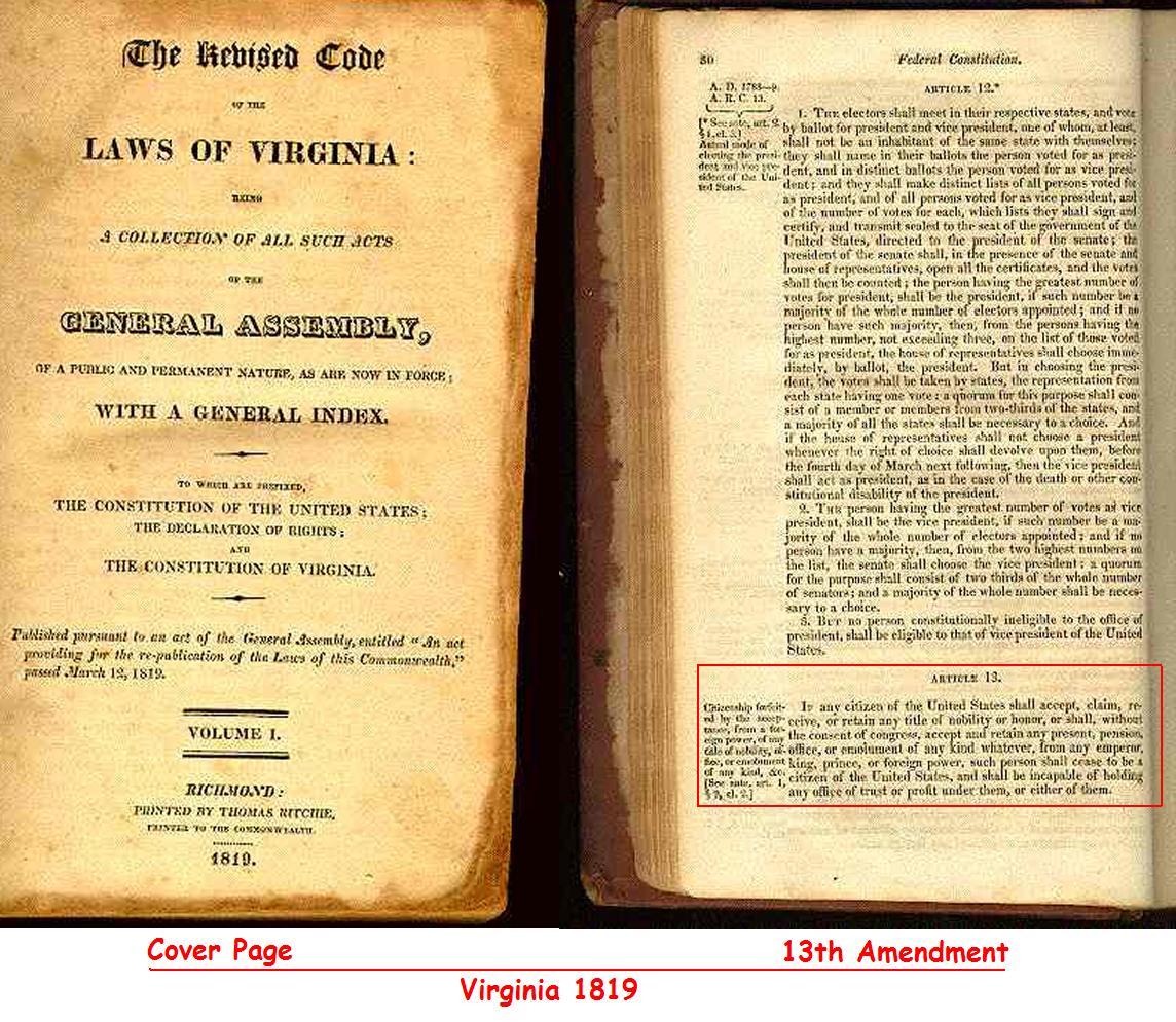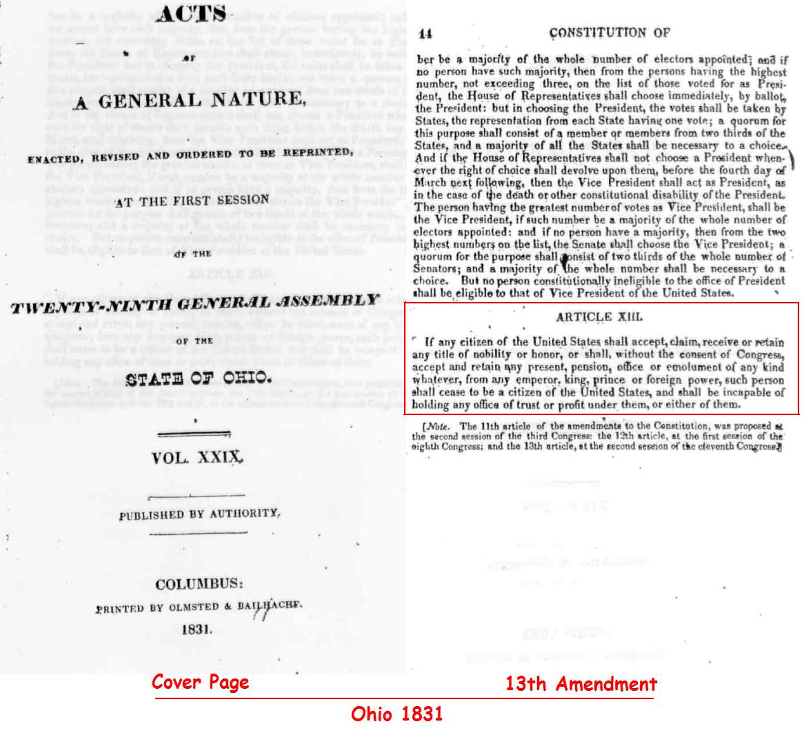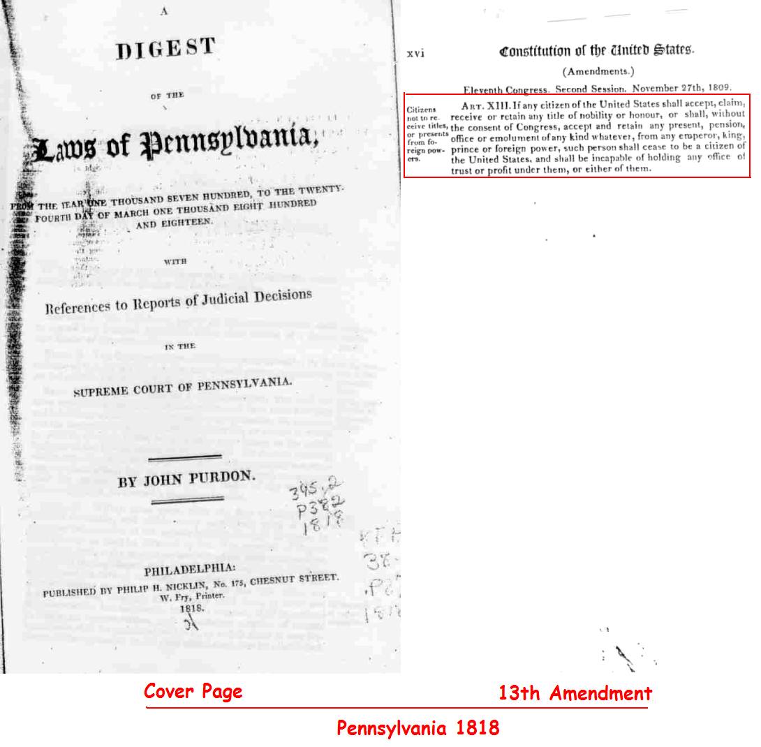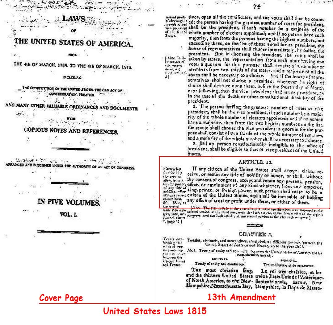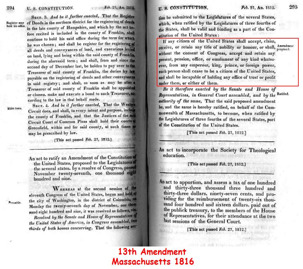 (Considerable controversy surrounds this Amendment - The official position of the Federal Government is that it was never ratified - but - in the past few months there is more than ample evidence that shows the Amendment was properly ratified on December 9, 1812, and if not then, certainly no later than March 10, 1819.