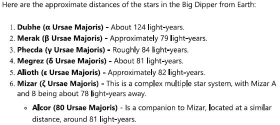 (In doing research on the names of the stars in the Big Dipper, there seems to be some slight variations in how a few of these stars are spelled). Now, keep in mind that just "ONE" light year is approximately 5.88 trillion miles. This would make the following Big Dipper stars approximately this many miles away from earth, if true: